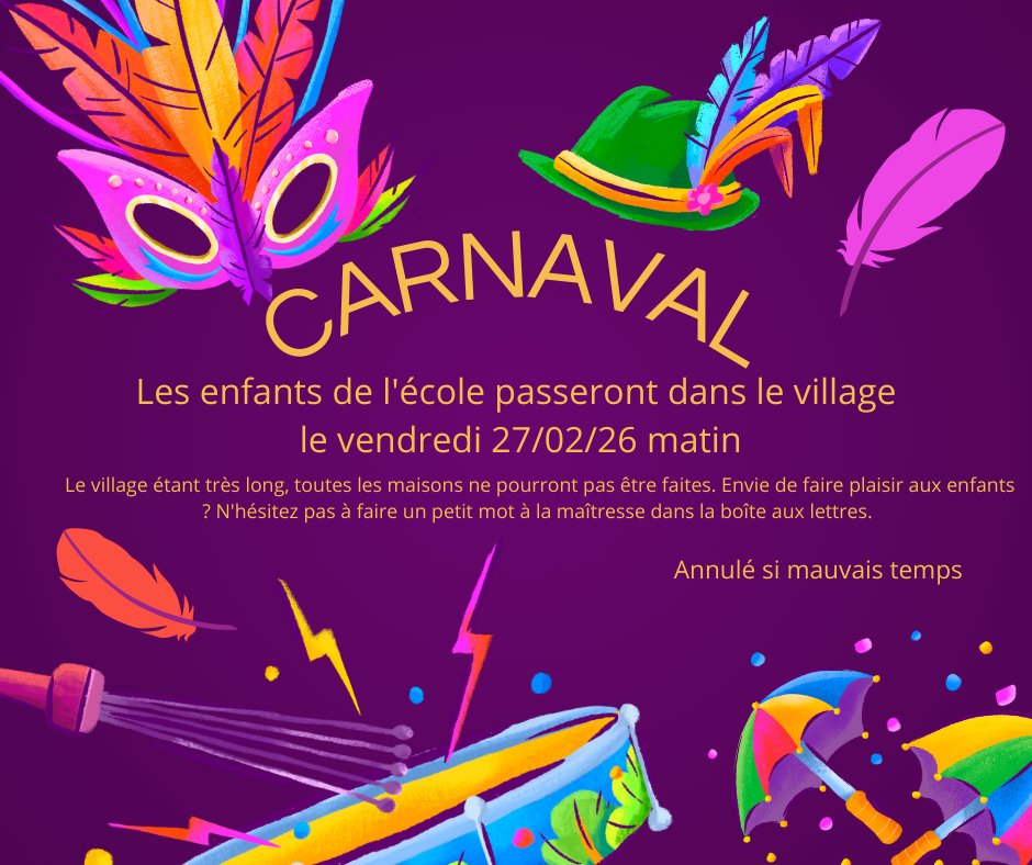 Les enfants du RPI se déplaceront dans les villages à l'occasion du Carnaval le vendredi 27/02 matin. En cas de mauvais temps, la course sera annulée. Je précise que nous n'allons malheureusement pas forcément pouvoir nous rendre auprès de chaque maison car cela engendrerait de longs temps de marche pour les plus petits. N'hésitez pas à vous faire connaitre si vous voulez aider les enfants, la récolte sera mise à leur disposition pour les sorties scolaires. Mme Amélie Bouillet