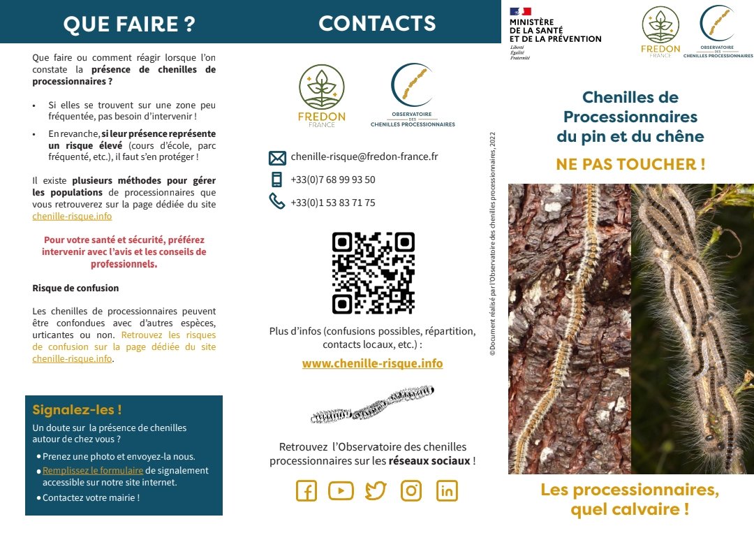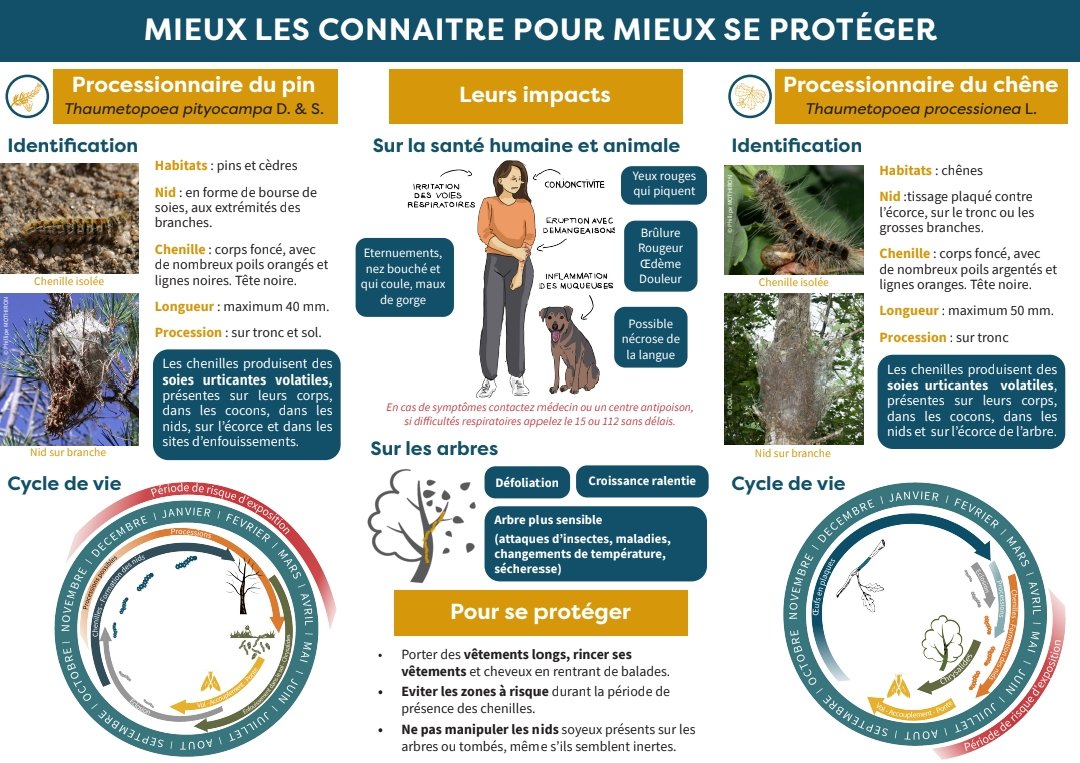 Ces chenilles sont recouvertes de poils très urticants, qui peuvent causer des lésions au niveau des yeux, des démangeaisons sur la peau et des irritations des voies respiratoires. Les chiens qui essaient de les manger peuvent avoir des blessures graves, allant jusqu'à la nécrose de la langue. Nous prendrons des mesures pour éviter leur propagation. En attendant, vous trouverez ci-joint les règles de prudence à appliquer.