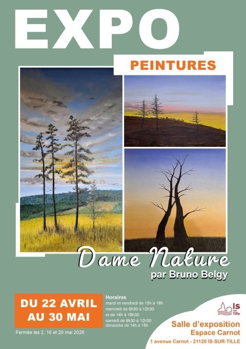 du 22 avril au 30 maisalle d'exposition de l'espace Carnotouverte aux horaires de la bibliothèque• mardi et vendredi : 15 h - 18 h• mercredi : 9 h 30 - 12 h 30 et 14 h - 18 h 30• samedi : 9 h 30 - 12 h 30et présence de l'artiste les dimanches de 14 h à 15 h : 24 avril, 10, 17 et 24 mai Informations au 03 80 95 23 33